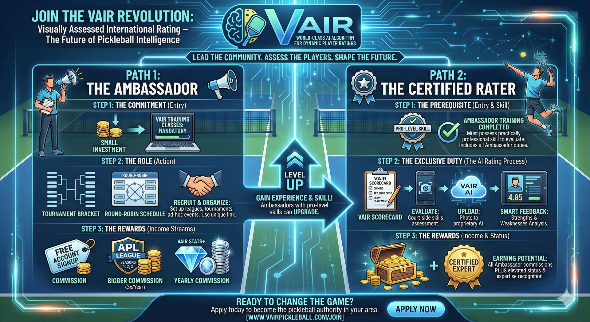 Introduce exciting pickleball initiatives to your community and earn money on the court. You can manage your entire business through VAIR—we'll guide you every step of the way! Choose one of the applications below to become a Certified Rater or Ambassador with VAIR and play a vital role in fostering a thriving pickleball community! When you help others discover the power of VAIR’s ratings, leagues, and events, you’ll earn direct commissions & residual payments—loaded directly onto your exclusive VAIR-branded VISA card.